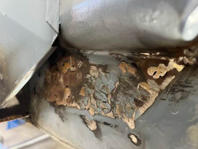 Der Karosseriebauer hat mit den Arbeiten am Chassis begonnen. Bisher wurden Bleche im Kofferraum und Fußraum überarbeitet. Im Kofferraum gab es einige Stellen, die auf den ersten Blick nicht zu erkennen waren. Aktuell wird an den B-Säulen und Querlenkeraufnahmen vorne gearbeitet.