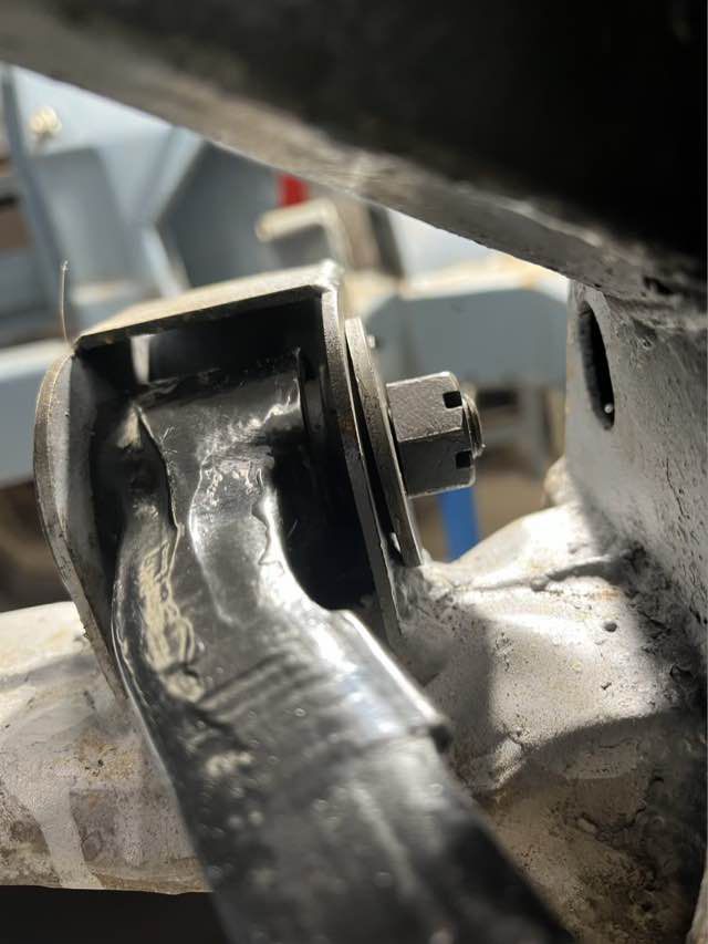 Die vordere, obere Befestigung für den Hebelstoßdämpfer musste repariert werden. Die Hebelstoßdämpfer werden mit vier Schrauben auf einer Grundplatte befestigt. Die Muttern sind unter der Grundplatte verschweißt, hier hatte sich eine Mutter gelöst.