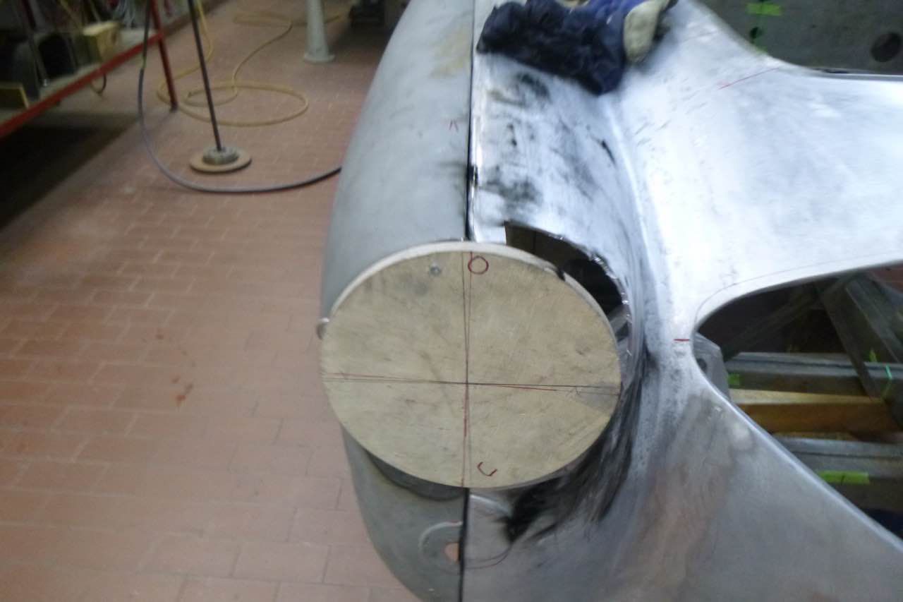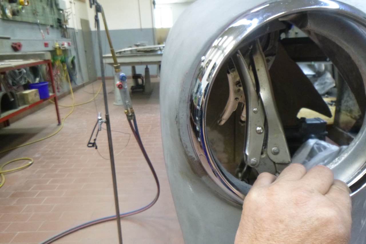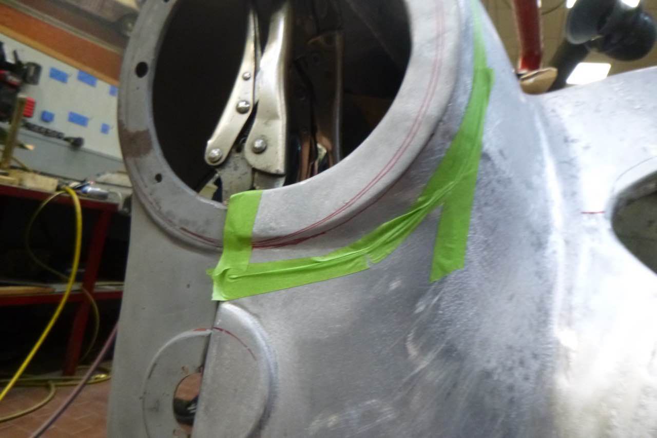 Die Berabeitung kann immer nur, das ist eine Austin Healey Besonderheit, im zusammengebauten Zustand, also beide Kotflügel, zu beurteilen. Das erschwert die Arbeiten zusätzlich. Dazu kommt auch, dass die Lampen zur Hälfte im Shroud und Kotflügel sitzen, d.h. die Ausschnitte müssen zusammen passen ansonsten sitzen die Scheinwerfer später nicht richtig.