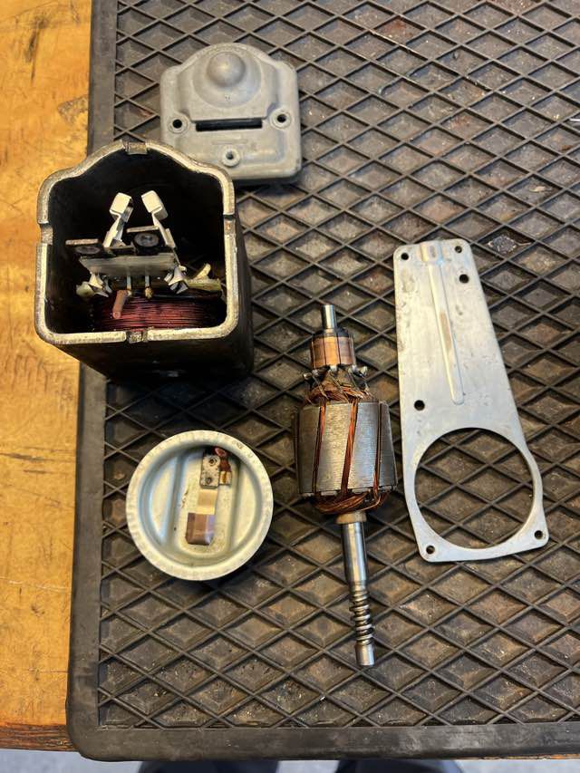 Im Austin Healey wurde ein Lucas DR2 Motor (Single Speed) verbaut. Das Kabel von dem Endabschalter wurde durchgetrennt, warum kann ich nicht sagen. Ansonsten machen der Motor und auch der restliche Antrieb einen guten Eindruck. Wir werden diesen jetzt säubern, neu fetten. Das Kabel wird wieder erneuert, die Kohlen sehen noch gut aus.