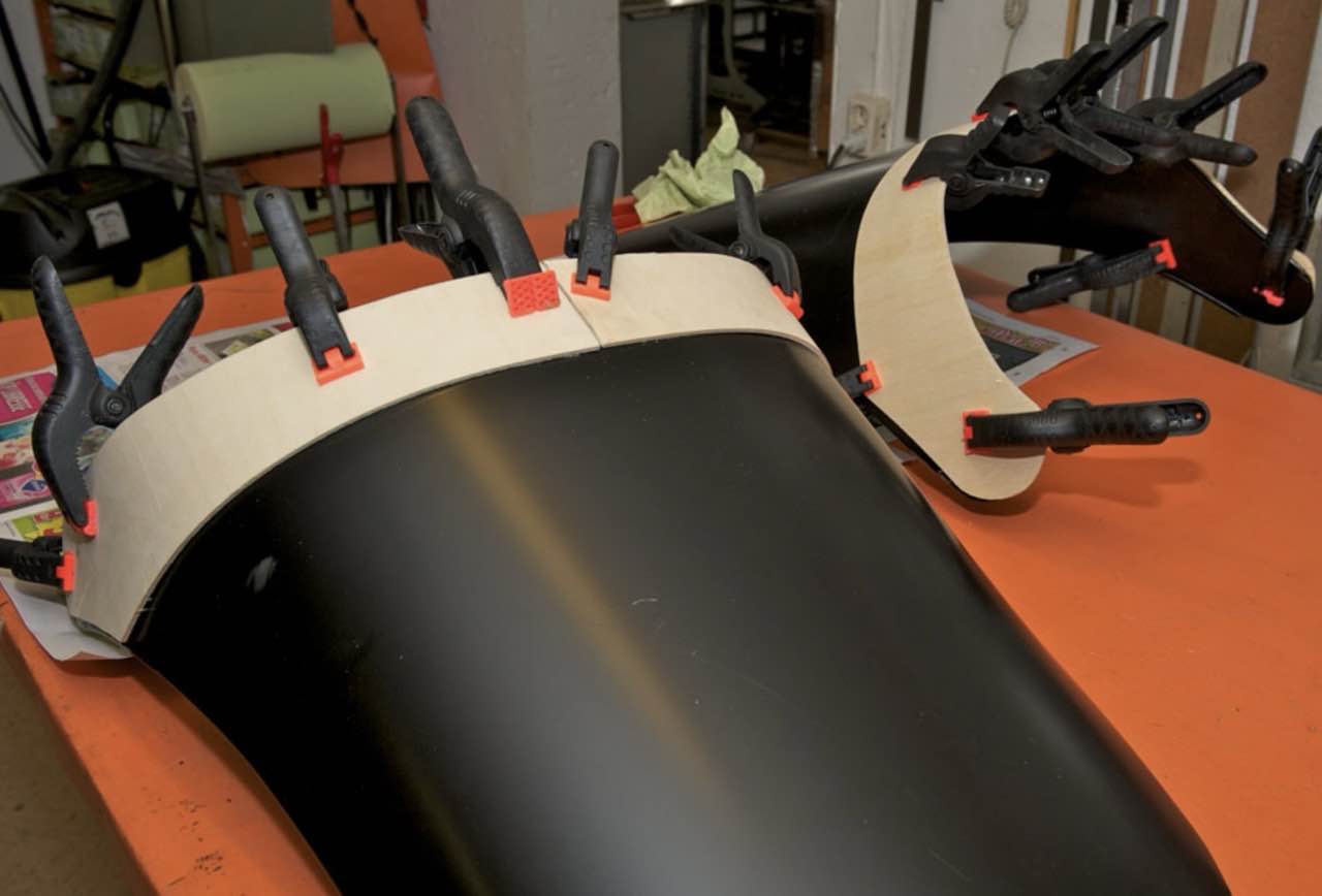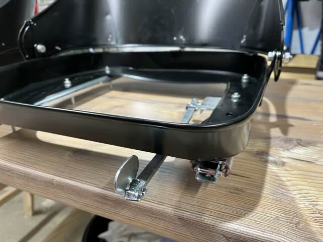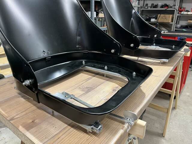 Die Sitzschalen wurden gesandstrahlt und anschließend Pulverbeschichtet. Damit der Karosserieschlosser die richtigen Bohrungen setzen kann, haben wir die Schalen vorab zusammengebaut.