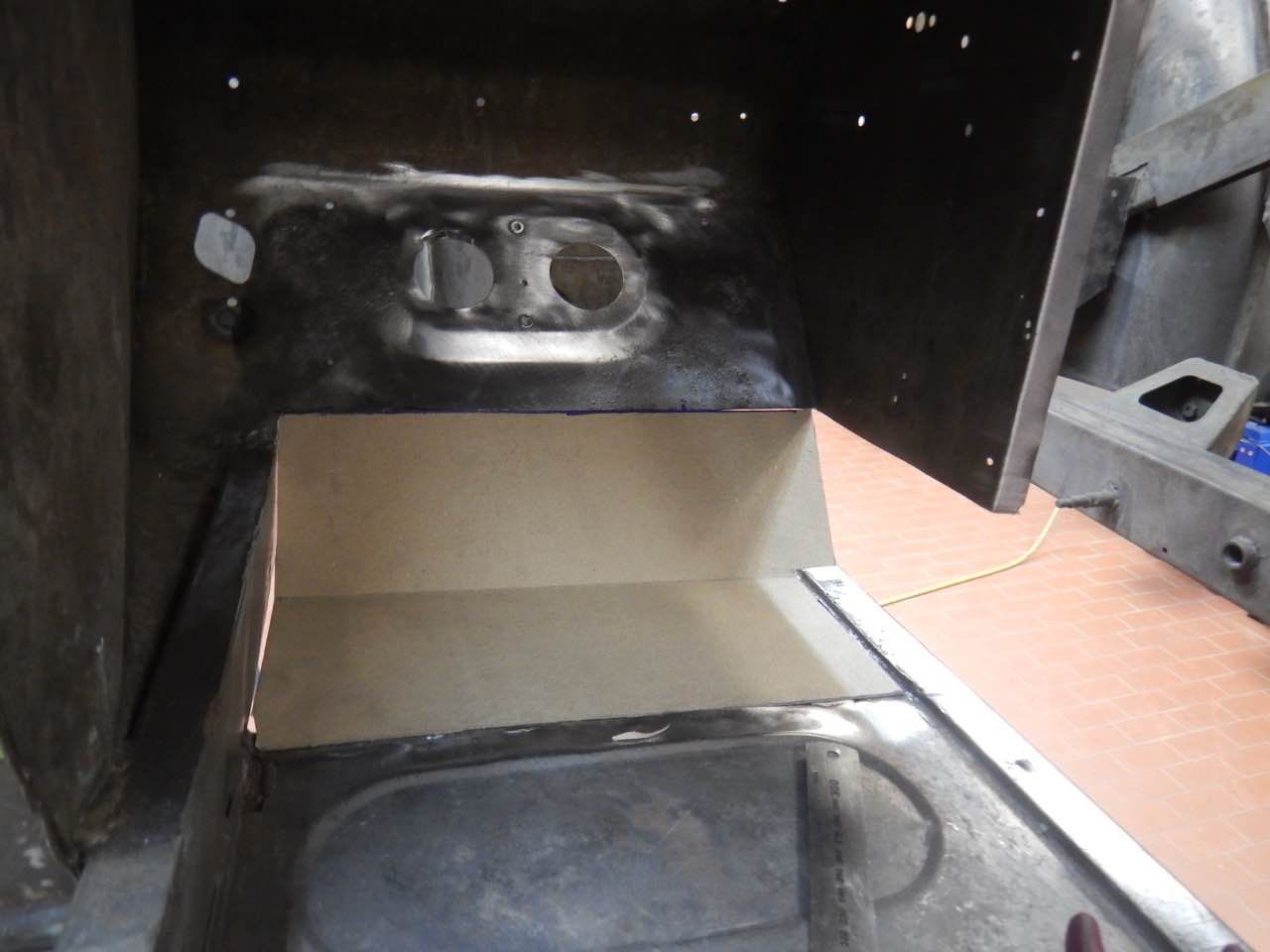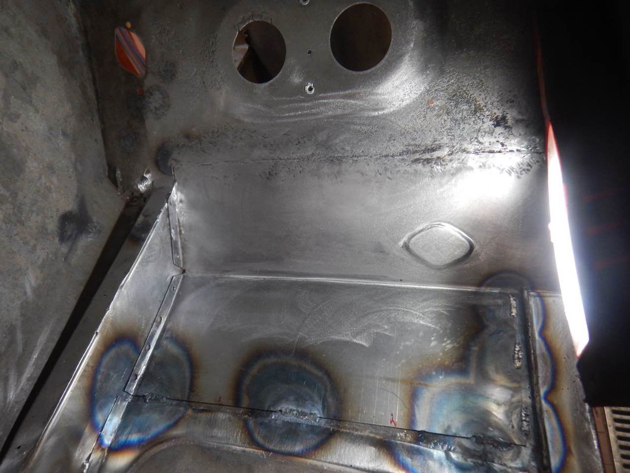 Der Fussraum auf der Fahrerseite musste überarbeitet werden. Eins der Blecher, auf den Abbildungen ist das ganz gut zu erkennen, musste ersetzt werden. Das Blech wurde nit den entsprechenden Sicken angefertigt und eingeschweißt. Es wurden ebenfalls die seitlichen Anschlussbleche überarbeitet.