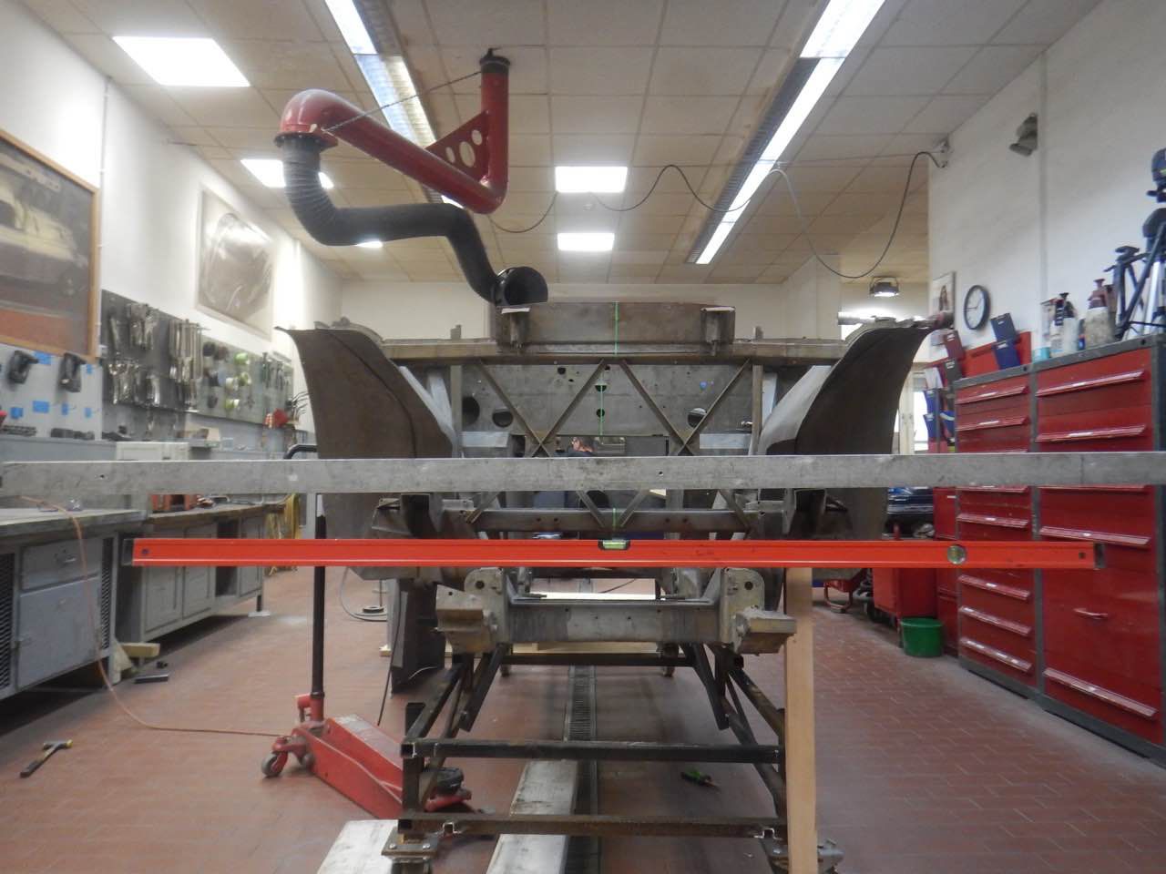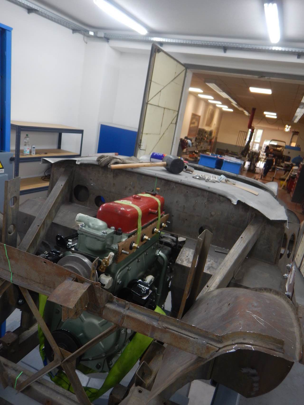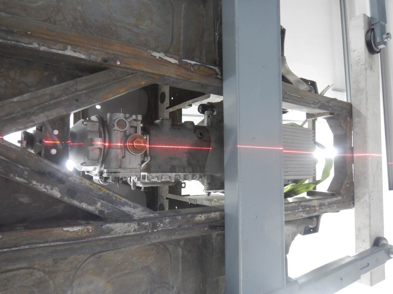 Damit sichergestellt werden kann ob der Motor zentrisch im Chassis ausgerichtet ist, haben wir den Motor samt Getriebe zu dem Karosserieschlosser gebracht. Nur so kann festgestellt werden ob die Motorbefestigungen korrekt sind.