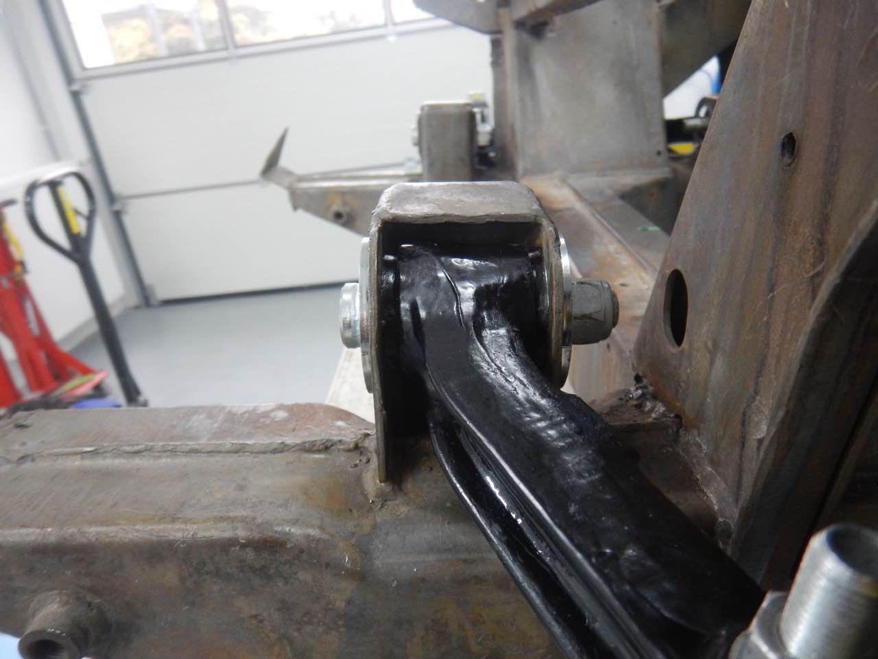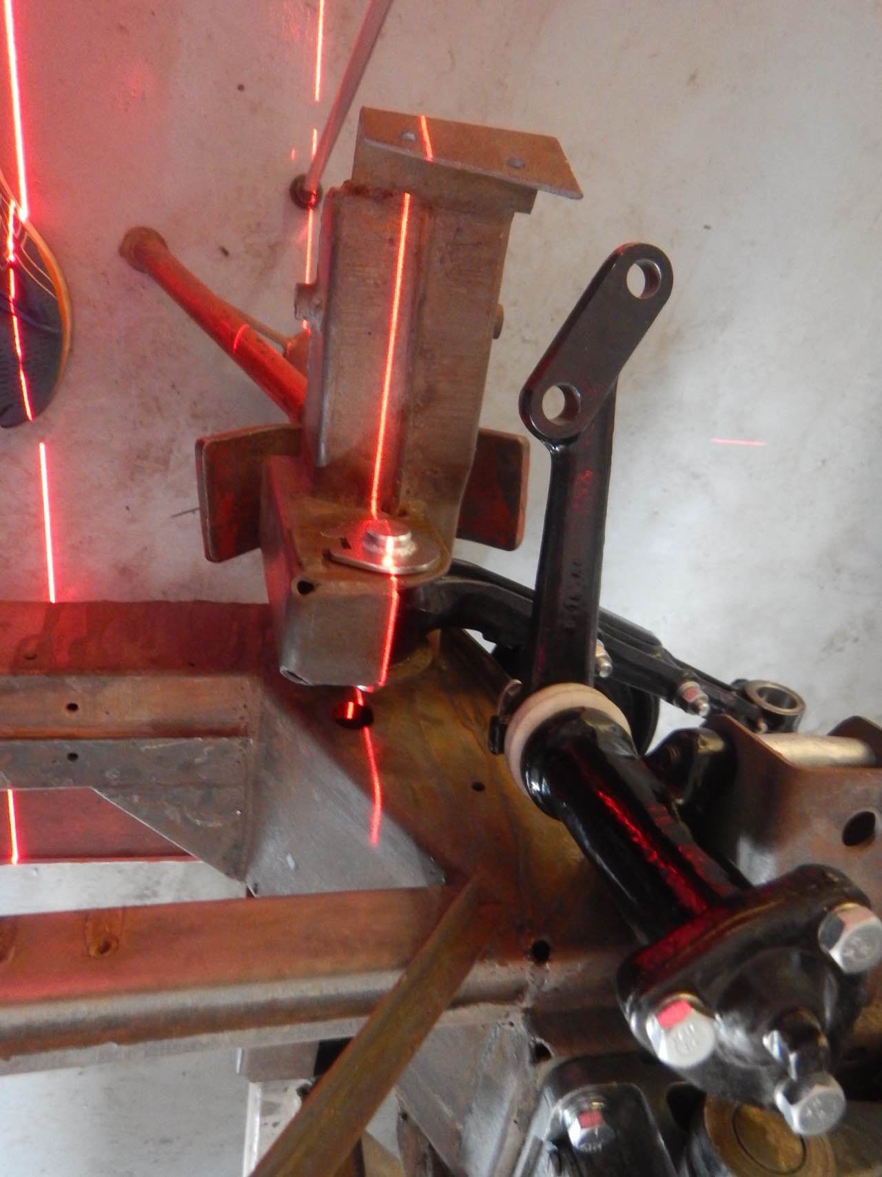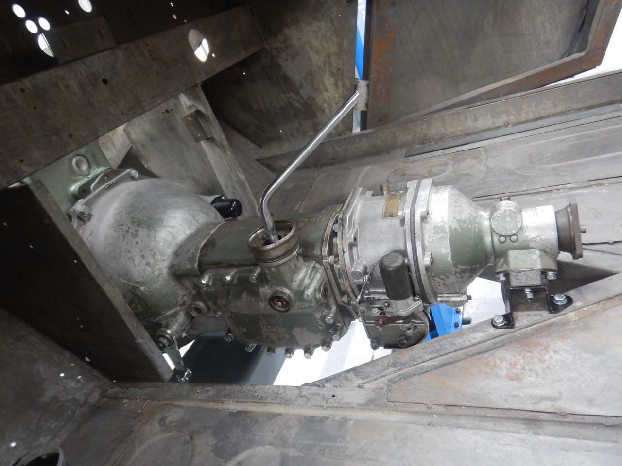 Damit sichergestellt werden kann ob der Motor zentrisch im Chassis ausgerichtet ist, haben wir den Motor samt Getriebe zu dem Karosserieschlosser gebracht. Nur so kann festgestellt werden ob die Motorbefestigungen korrekt sind.
