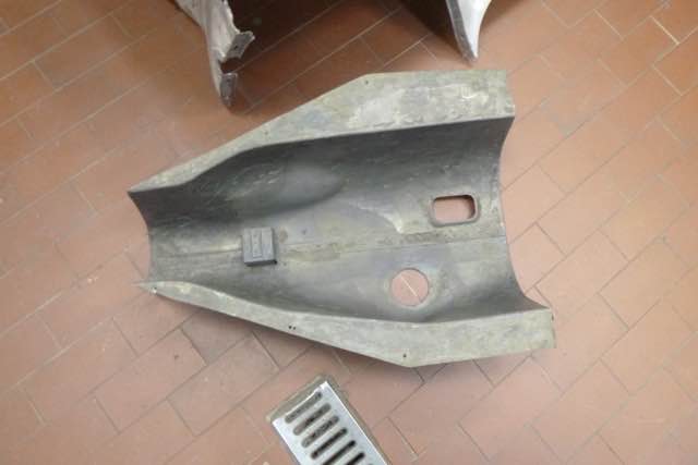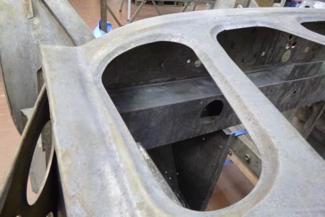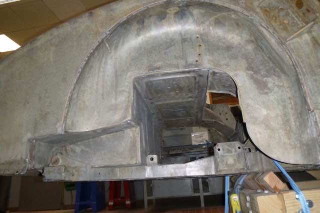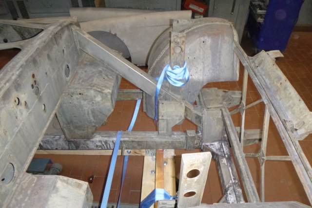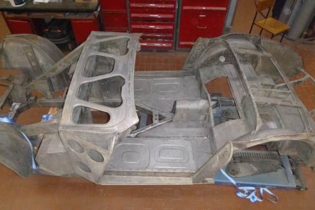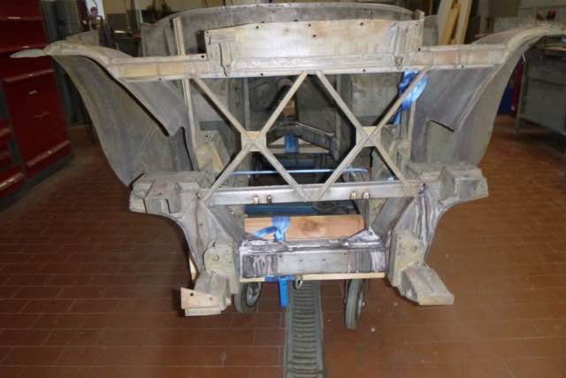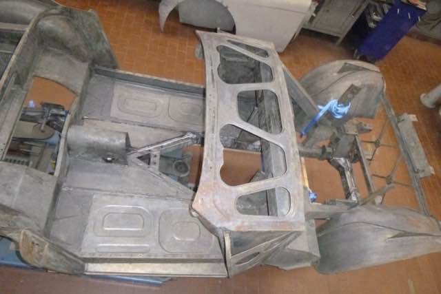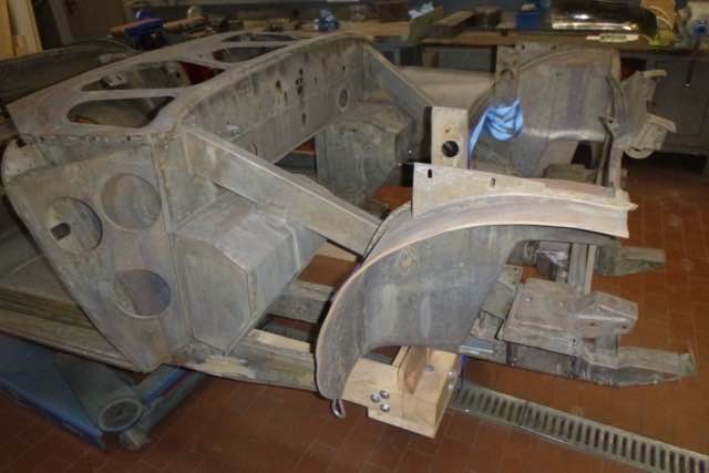 Die Karosserie wurde jetzt chemisch in einem Tauchbad entlackt. Interessant ist auf jeden Fall das Front-Shrould, auf der linken Seite gibt es einen Unfallschaden. Im nächsten Schritt wird zum einen geprüft, ob der Rahmen gerichtet werden muss und ob der Shroud wieder aufgebaut werden kann.