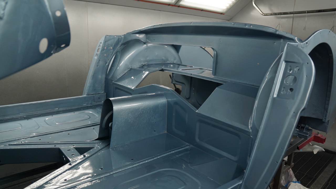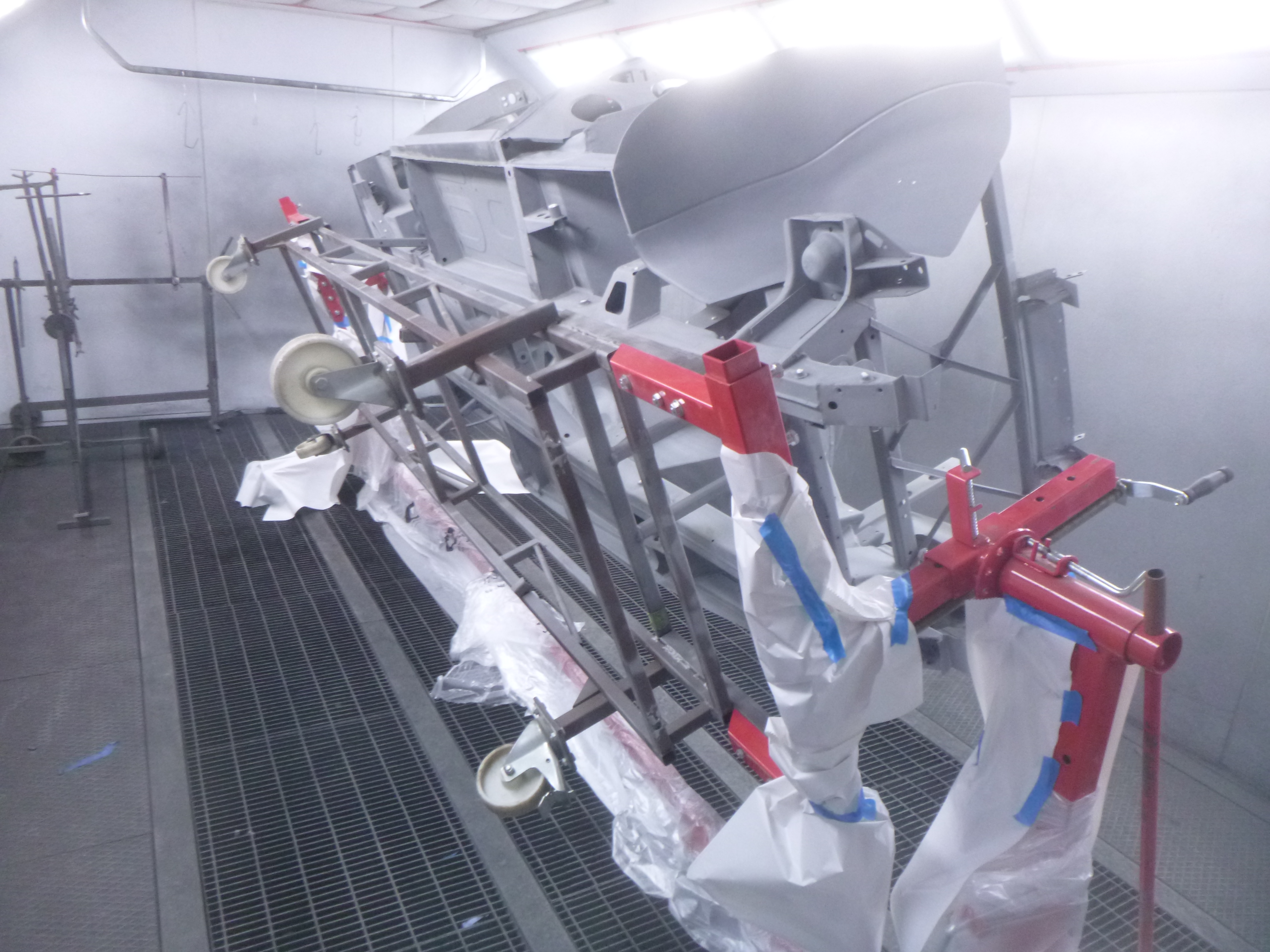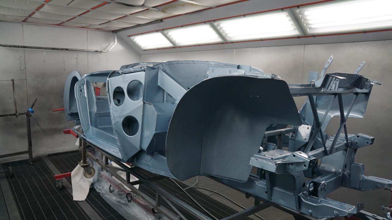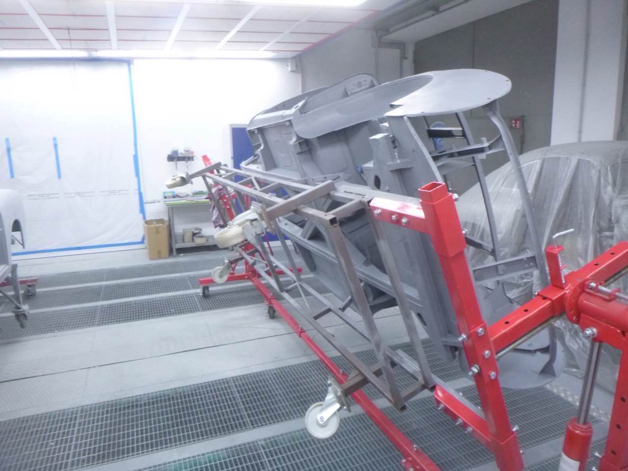 Nach der Lackierung von Chassis und den Innenseiten der Außenbleche erfolgt der Zusammenbau. Anschließend werden die Ausßenbleche gefüllert und geschliffen. Wenn diese Tätigkeiten abgeschlossen sind erfolgt die Montage der Achsen, Motor/Getriebe.