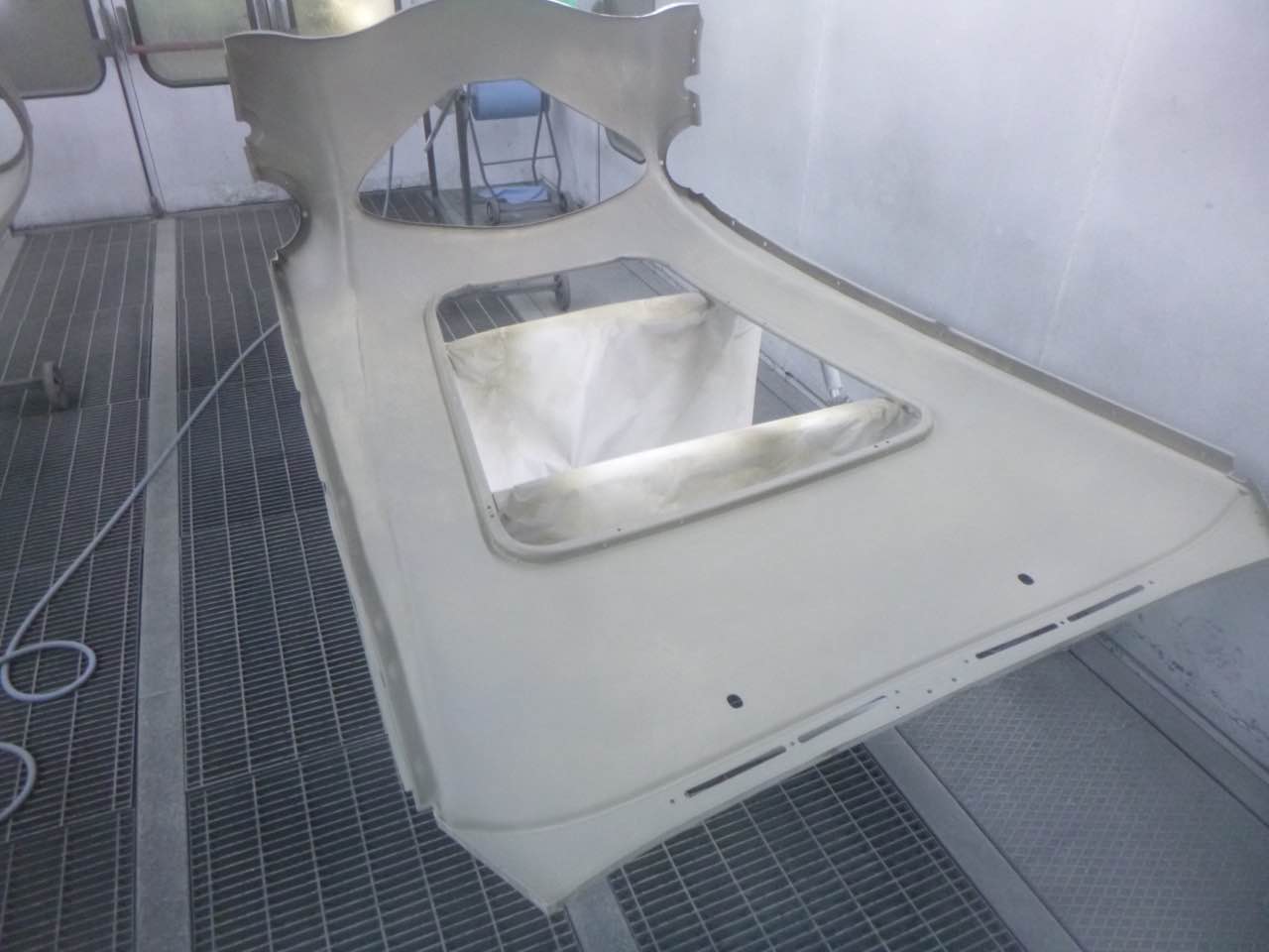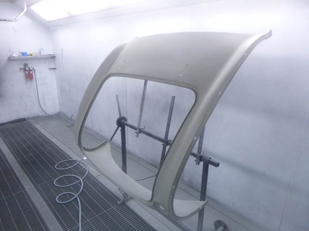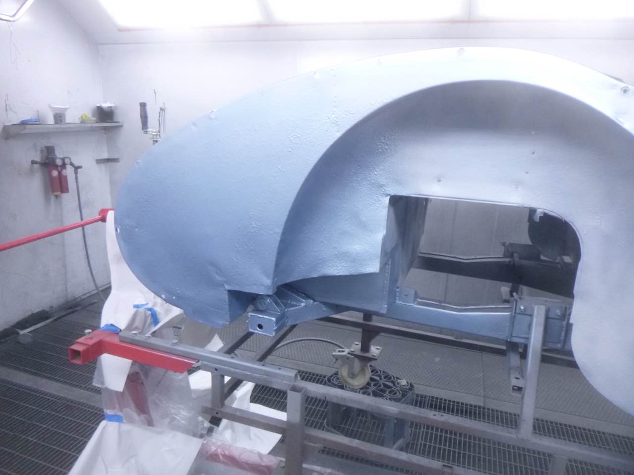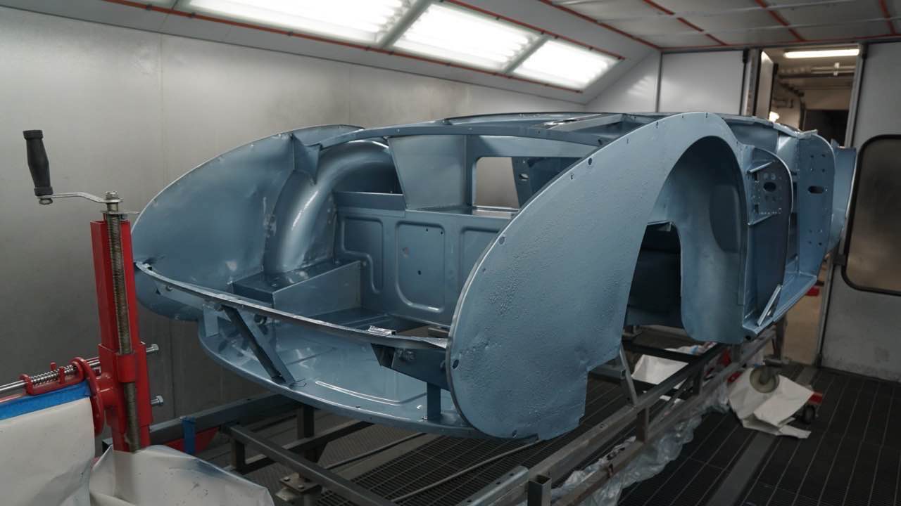 Nach der Lackierung von Chassis und den Innenseiten der Außenbleche erfolgt der Zusammenbau. Anschließend werden die Ausßenbleche gefüllert und geschliffen. Wenn diese Tätigkeiten abgeschlossen sind erfolgt die Montage der Achsen, Motor/Getriebe.