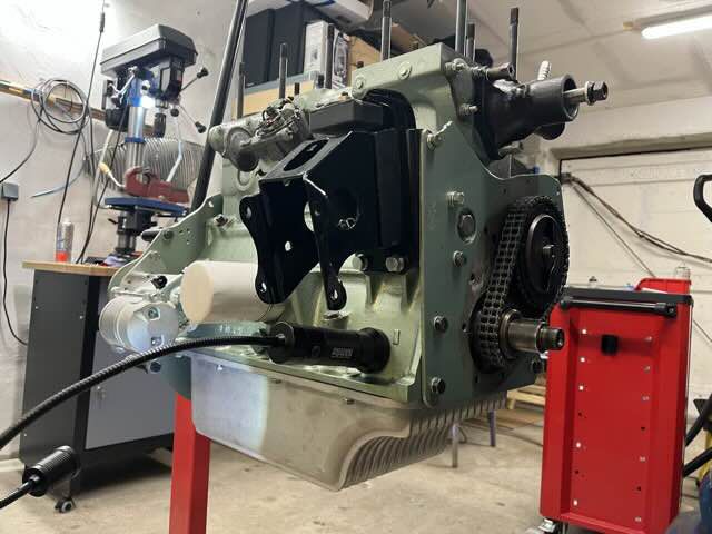 Motor ist überholt und wieder zurück. Es wurden neue Buchsen gesetzt mit neuen M-Kolben. Kurbelwelle ist neu gelagert und gewuchtet. Motor wurde auf Dichtheit geprüft und neu lackiert. In den kommenden Wochen wird der Motor zusammengebaut.