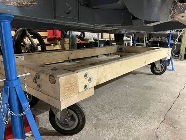 Das Chassis ist vorerst zurück in der Garage. Hier wartet das Chassis auf die weitere Fertigstellung. Wir haben das Chassis zunächst auf die Böcke gestellt, demnächst werden wir eine Unterkonstruktion bauen, die es gestattet, das Chassis in der Garage zu bewegen. Der Transportwagen ist fertig, wir können jetzt das Chassis in der Garage bewegen, das vereinfacht schon das Arbeiten in der Garage. Zudem müssen wir das Chassis auch zum Restaurationsbetrieb demnächst transportieren, das werden wir auch mit dem Chassis einfacher machen können.