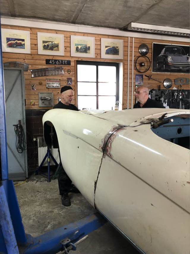 Der Karosseriebauer hat mit den Arbeiten am Chassis begonnen. Bisher wurden Bleche im Kofferraum und Fußraum überarbeitet. Im Kofferraum gab es einige Stellen, die auf den ersten Blick nicht zu erkennen waren. Aktuell wird an den B-Säulen und Querlenkeraufnahmen vorne gearbeitet.