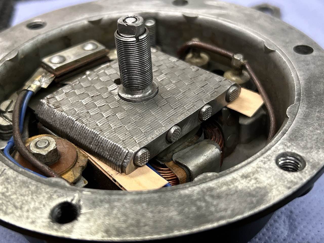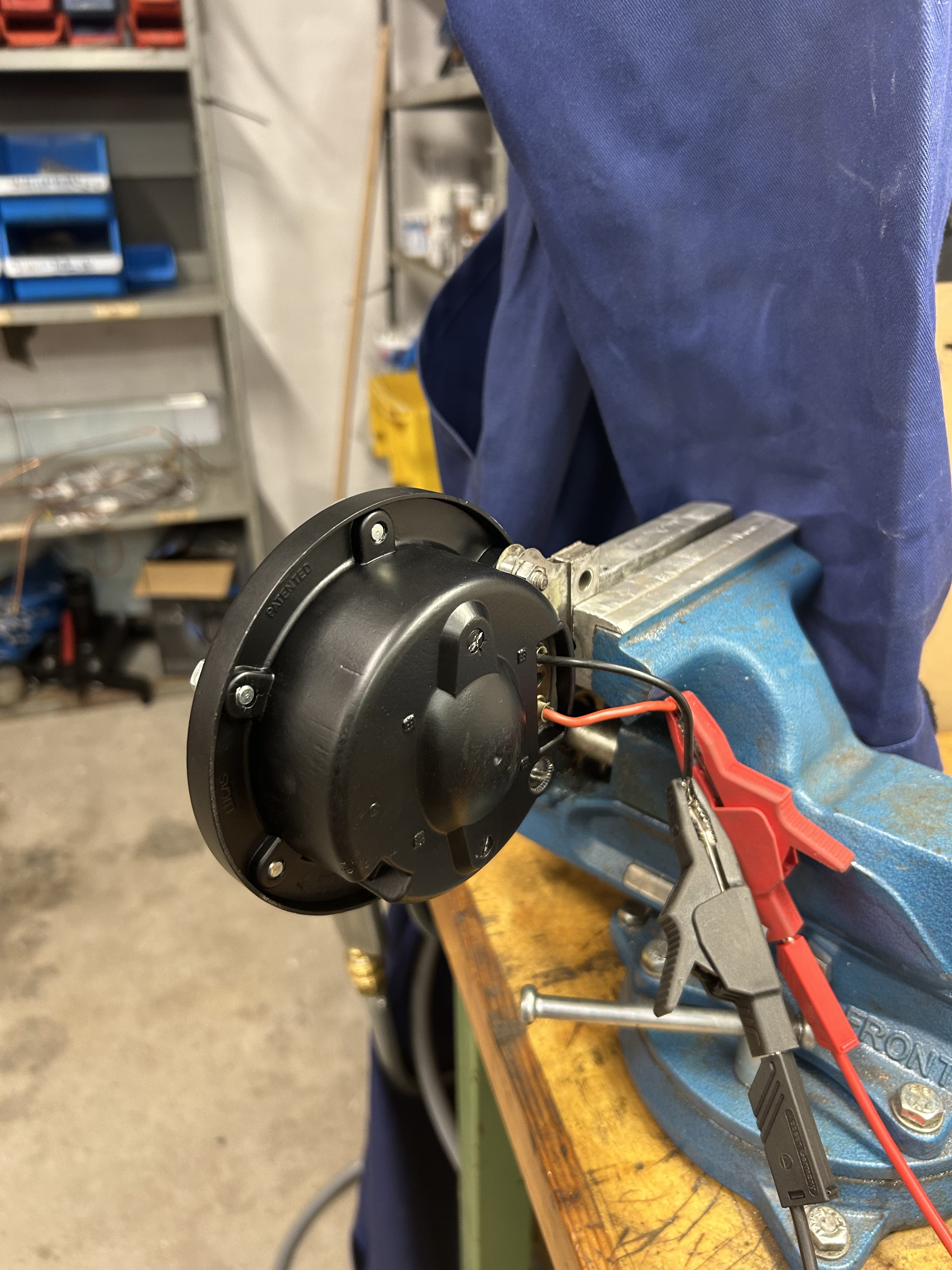 Um den Luftspalt einzustellen, sollte die „Einstellhülse” (siehe Explosionszeichnung) so lange gedreht werden, bis der richtige Wert erreicht ist. Dazu muss zunächst die Einstellschraube an der Rückseite des Horns einige Umdrehungen im Uhrzeigersinn gedreht werden, um die Kontaktpunkte vollständig zu schließen: Der Anker liegt nun auf dem Kern auf, wenn der Stromkreis an 12 V angeschlossen ist. Verwenden Sie ein Zifferblatt, um den Abstand in der Mitte der Membran zu messen. Lassen Sie das Horn nicht zu lange eingeschaltet, da die Spule (zu) heiß werden kann. Wenn der richtige Luftspalt erreicht ist, muss der Kontaktunterbrecher mit der Einstellschraube auf der Rückseite so lange eingestellt werden, bis ein lauter Ton zu hören ist. Mit derselben Schraube wird auch der maximale Strom eingestellt, der maximal etwa 4 Ampere betragen sollte. Jetzt sollte Ihre Hupe „laut und deutlich” funktionieren.