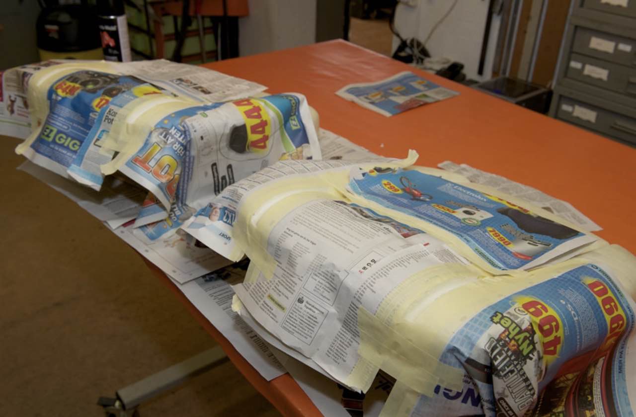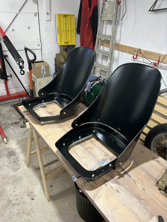 Die Sitzschalen wurden gesandstrahlt und anschließend Pulverbeschichtet. Damit der Karosserieschlosser die richtigen Bohrungen setzen kann, haben wir die Schalen vorab zusammengebaut.