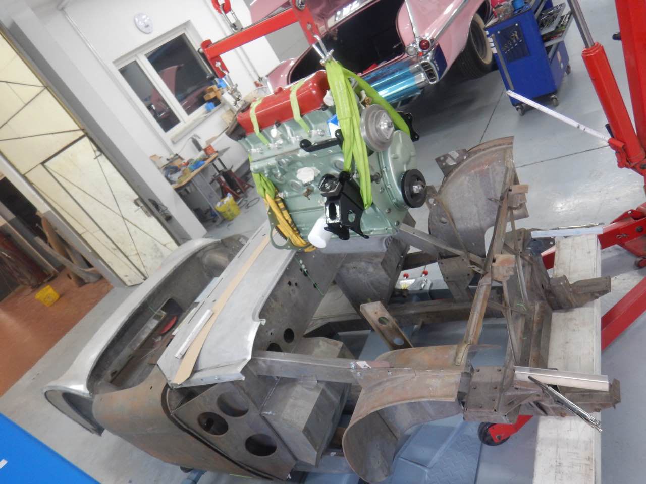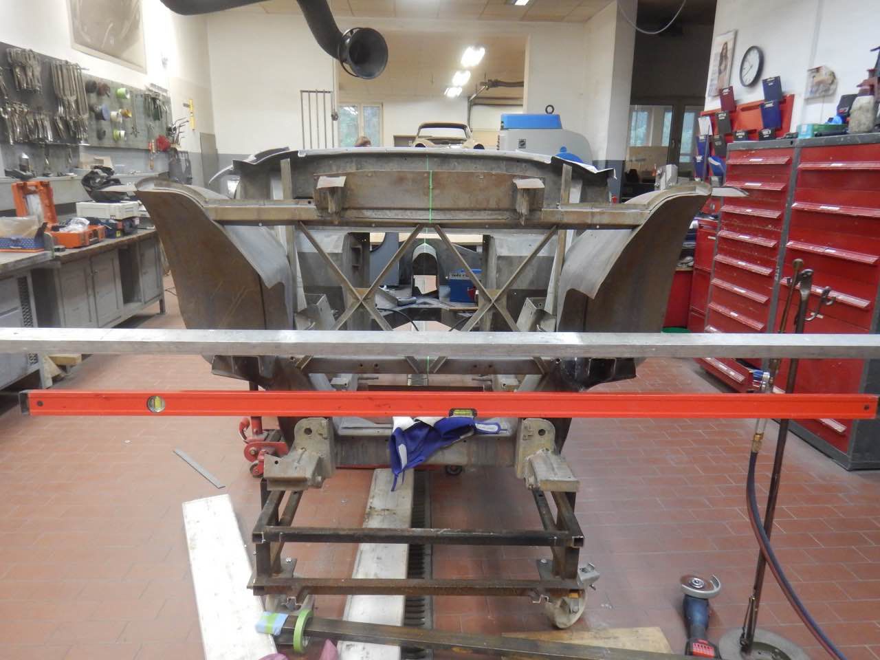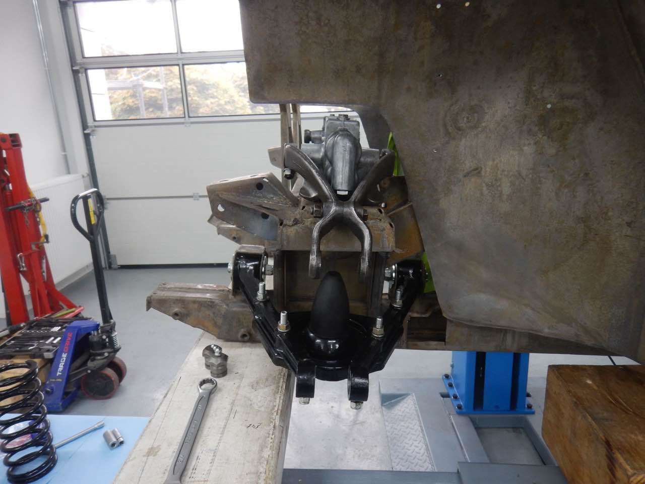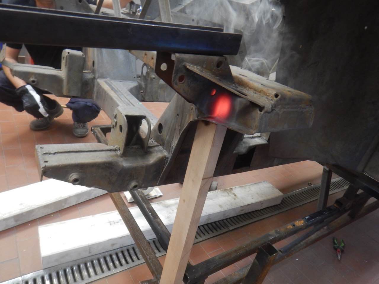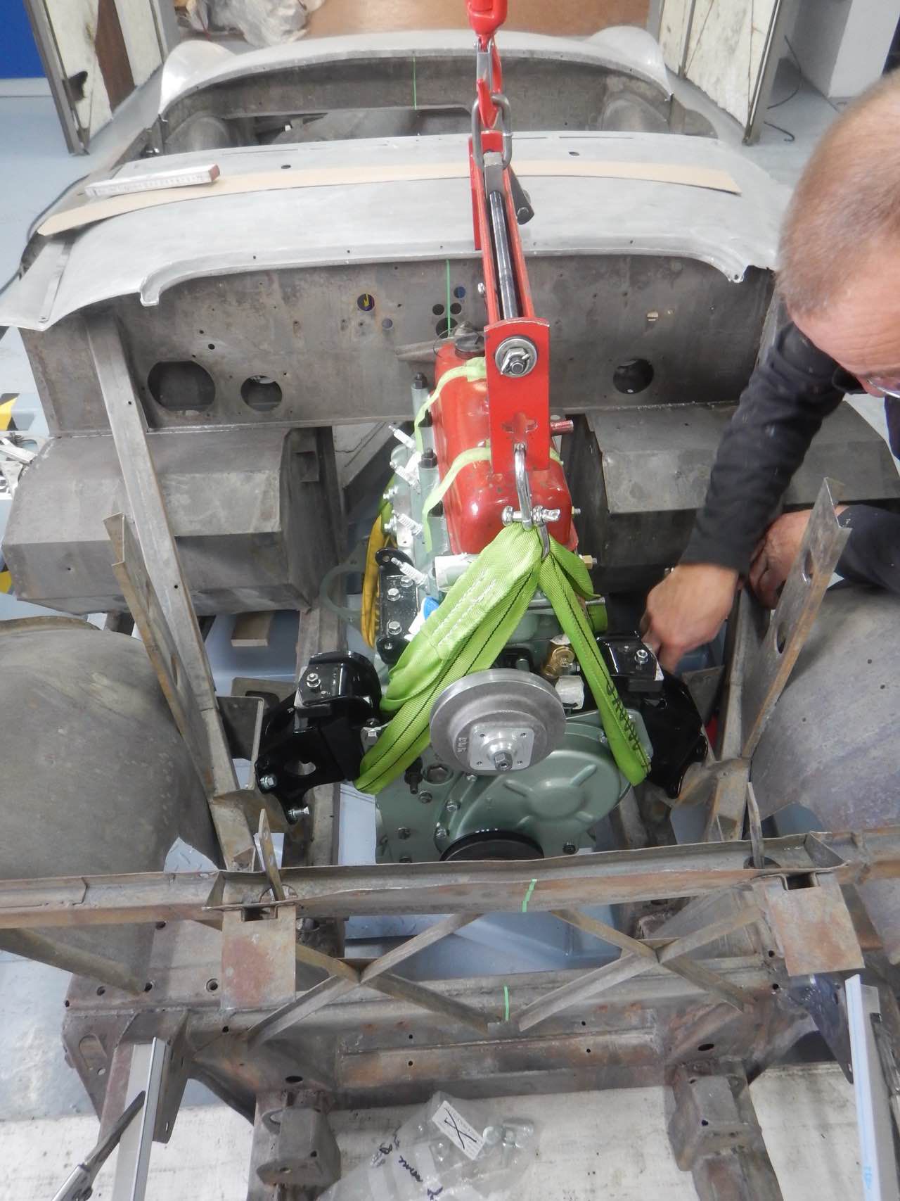 Damit sichergestellt werden kann ob der Motor zentrisch im Chassis ausgerichtet ist, haben wir den Motor samt Getriebe zu dem Karosserieschlosser gebracht. Nur so kann festgestellt werden ob die Motorbefestigungen korrekt sind.