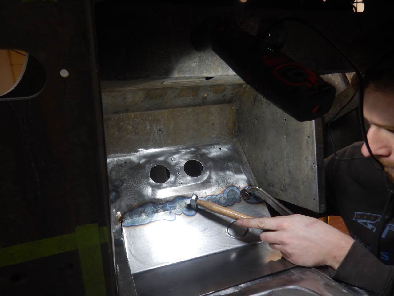 Der Fussraum auf der Fahrerseite musste überarbeitet werden. Eins der Blecher, auf den Abbildungen ist das ganz gut zu erkennen, musste ersetzt werden. Das Blech wurde nit den entsprechenden Sicken angefertigt und eingeschweißt. Es wurden ebenfalls die seitlichen Anschlussbleche überarbeitet.