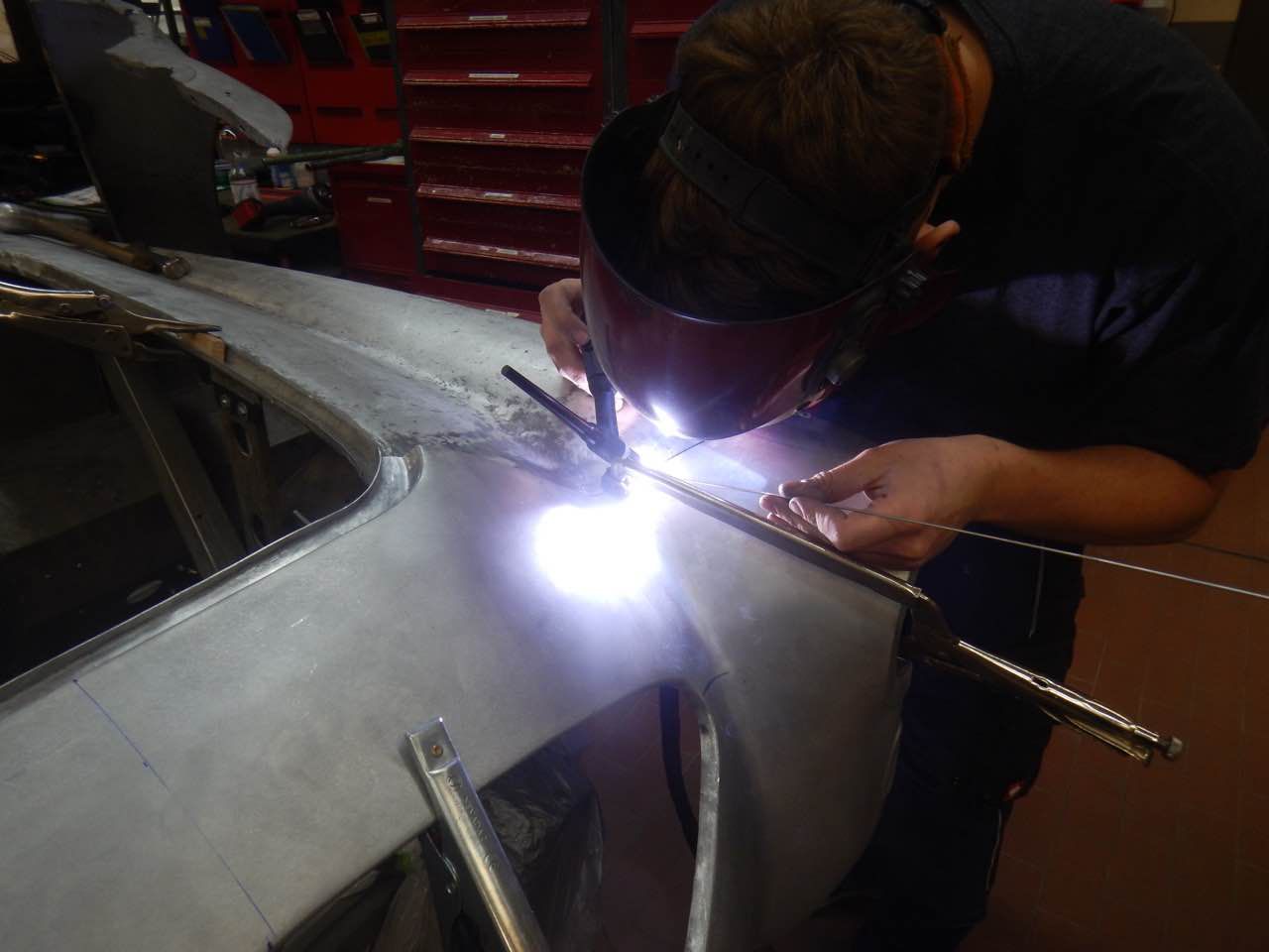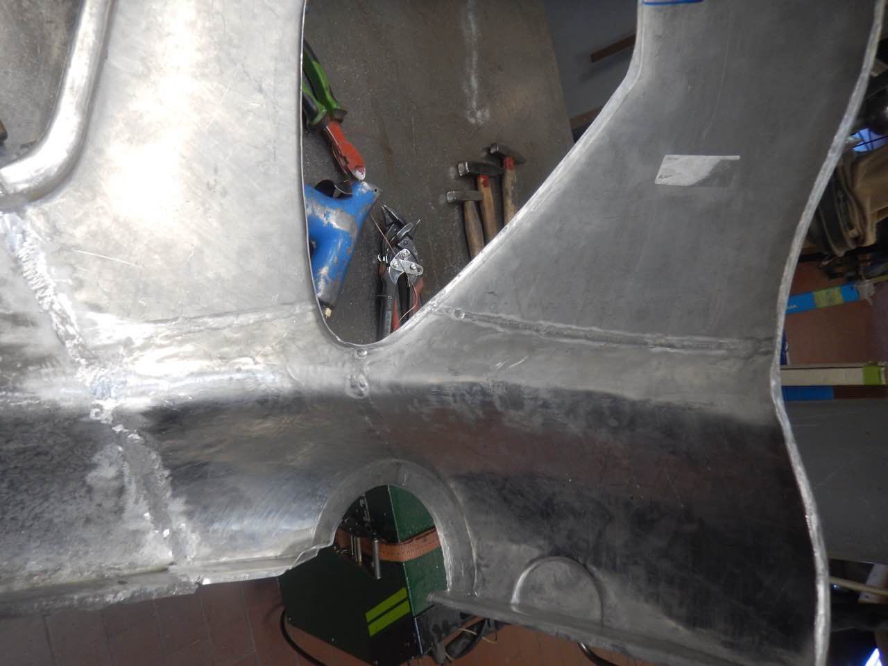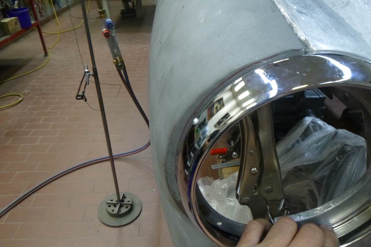 Die Berabeitung kann immer nur, das ist eine Austin Healey Besonderheit, im zusammengebauten Zustand, also beide Kotflügel, zu beurteilen. Das erschwert die Arbeiten zusätzlich. Dazu kommt auch, dass die Lampen zur Hälfte im Shroud und Kotflügel sitzen, d.h. die Ausschnitte müssen zusammen passen ansonsten sitzen die Scheinwerfer später nicht richtig.