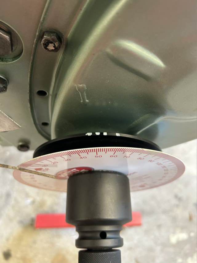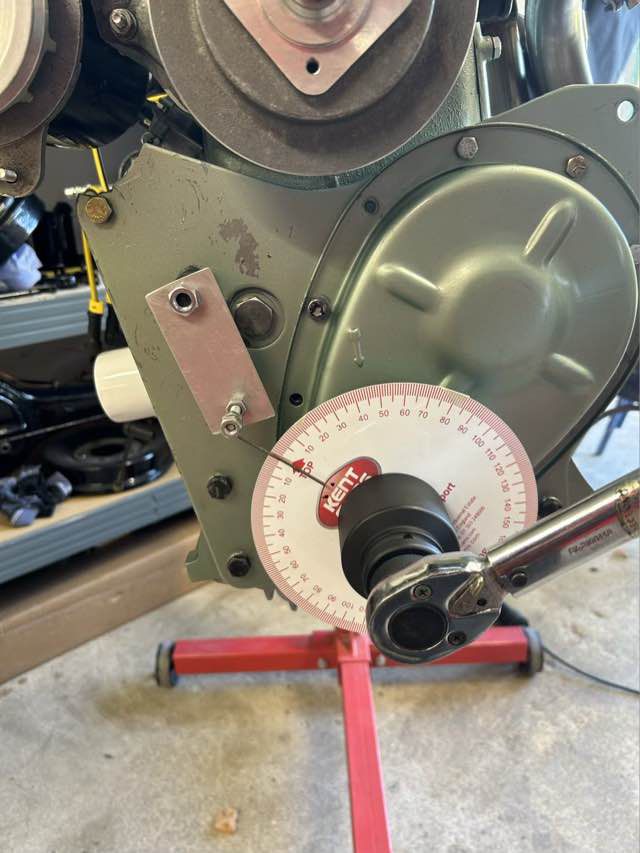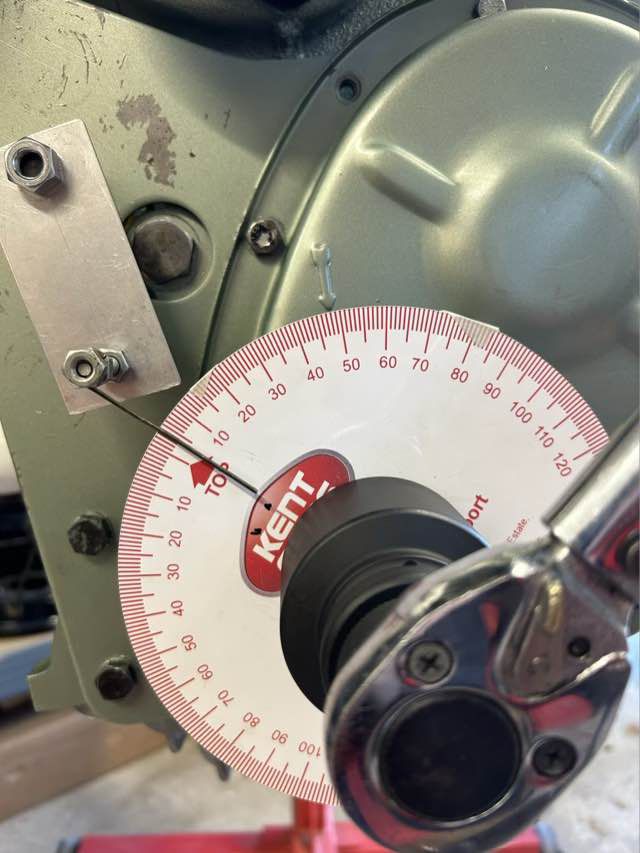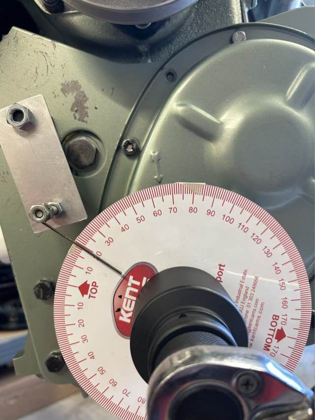 OT hatte ich schon vorab mit demontiertem Zylinderkopf und einer Messuhr bestimmt. Für die Gradzahl habe ich auf der Kurbelwelle eine Gradscheibe angebracht, nicht so einfach, ging aber dann doch. Zusätzlich habe ich mir eine Ablesehilfe befestigt.