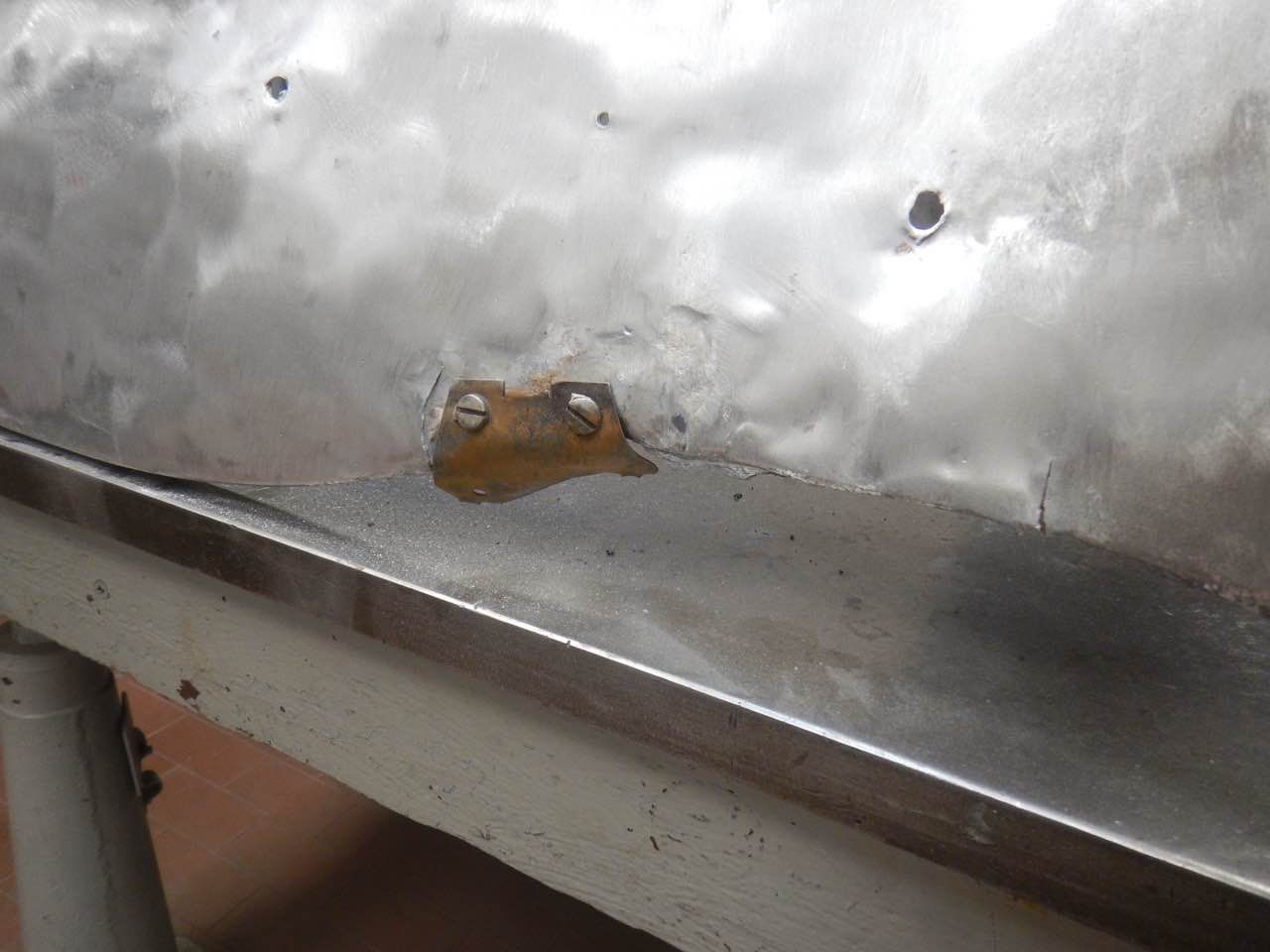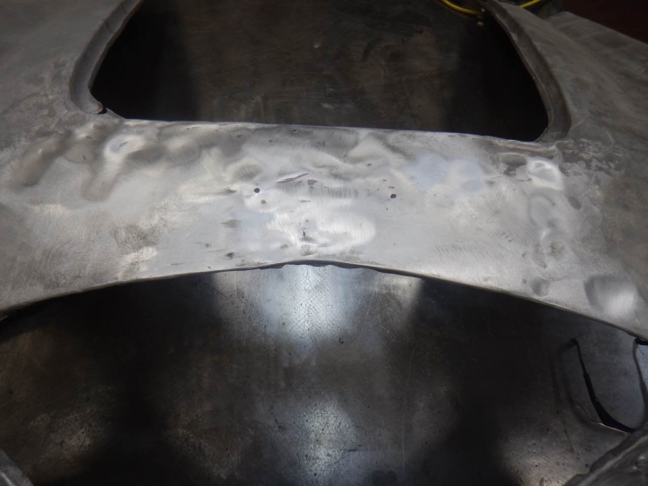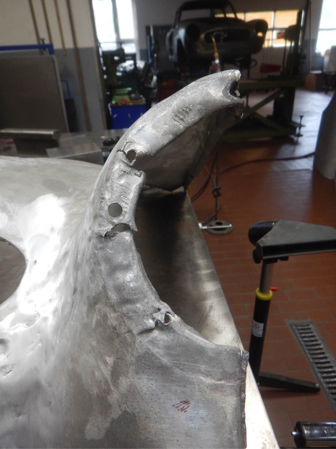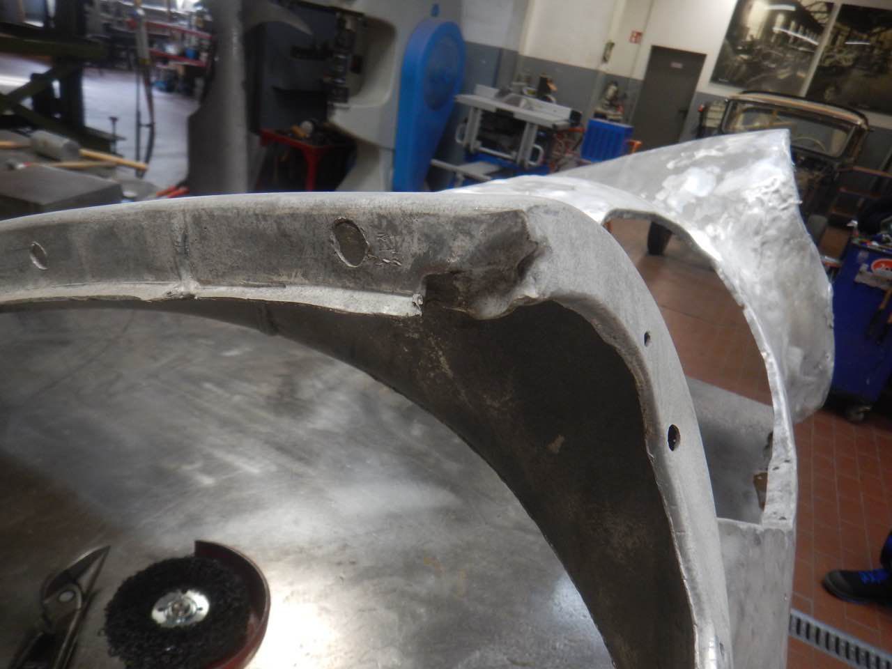 Das Frontshroud ist in keinem guten Zustand. Auf der Fahrerseite ist es im Bereich der Lampentöpfe stark beschädigt. Es wurde jedemenge Spachtel verwendet. Wir haben uns mit dem Restaurierungsbetrieb darauf verständigt nur für die Nase gegen ein Neuteil zu verwenden. Das Neuteil wird in das bestehende Teil eingearbeitet. Damit soll sich der Aufwand verringern.