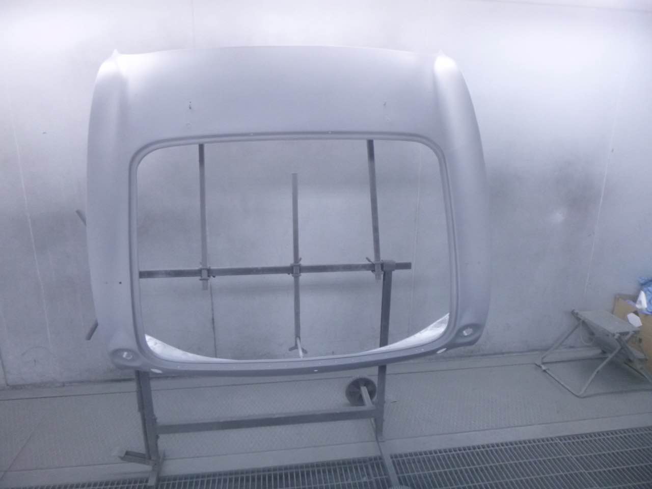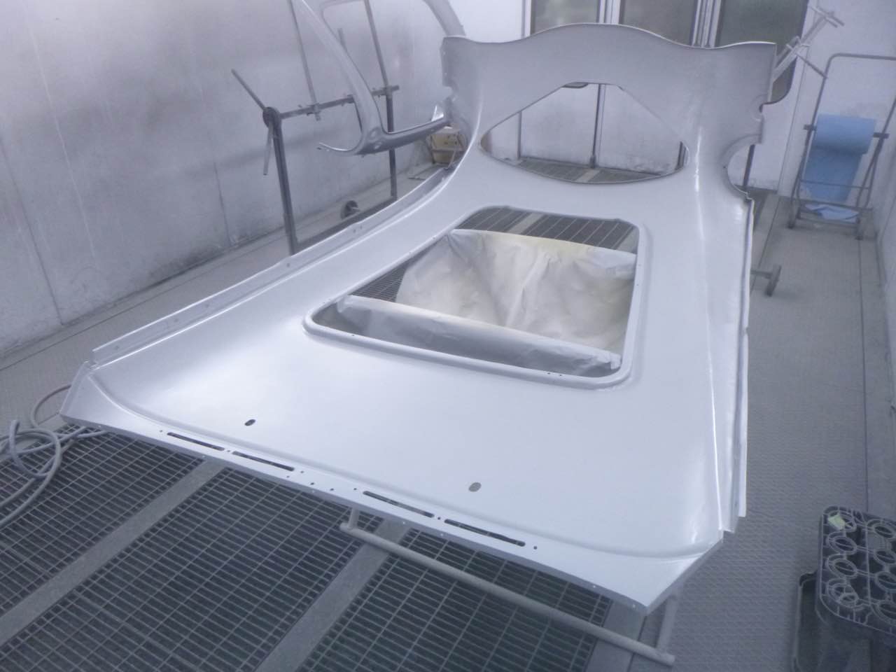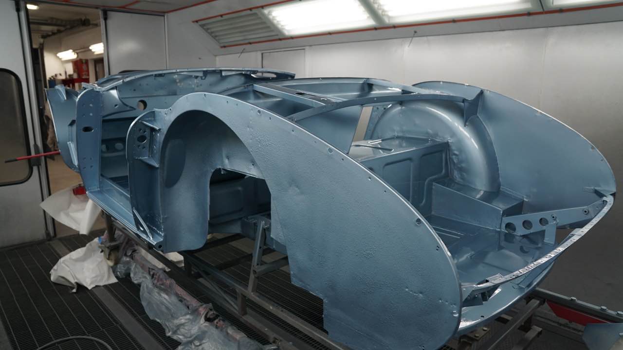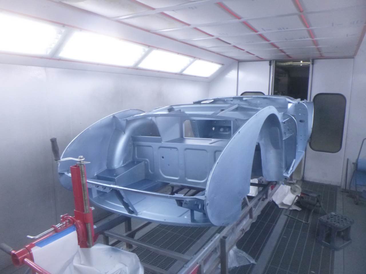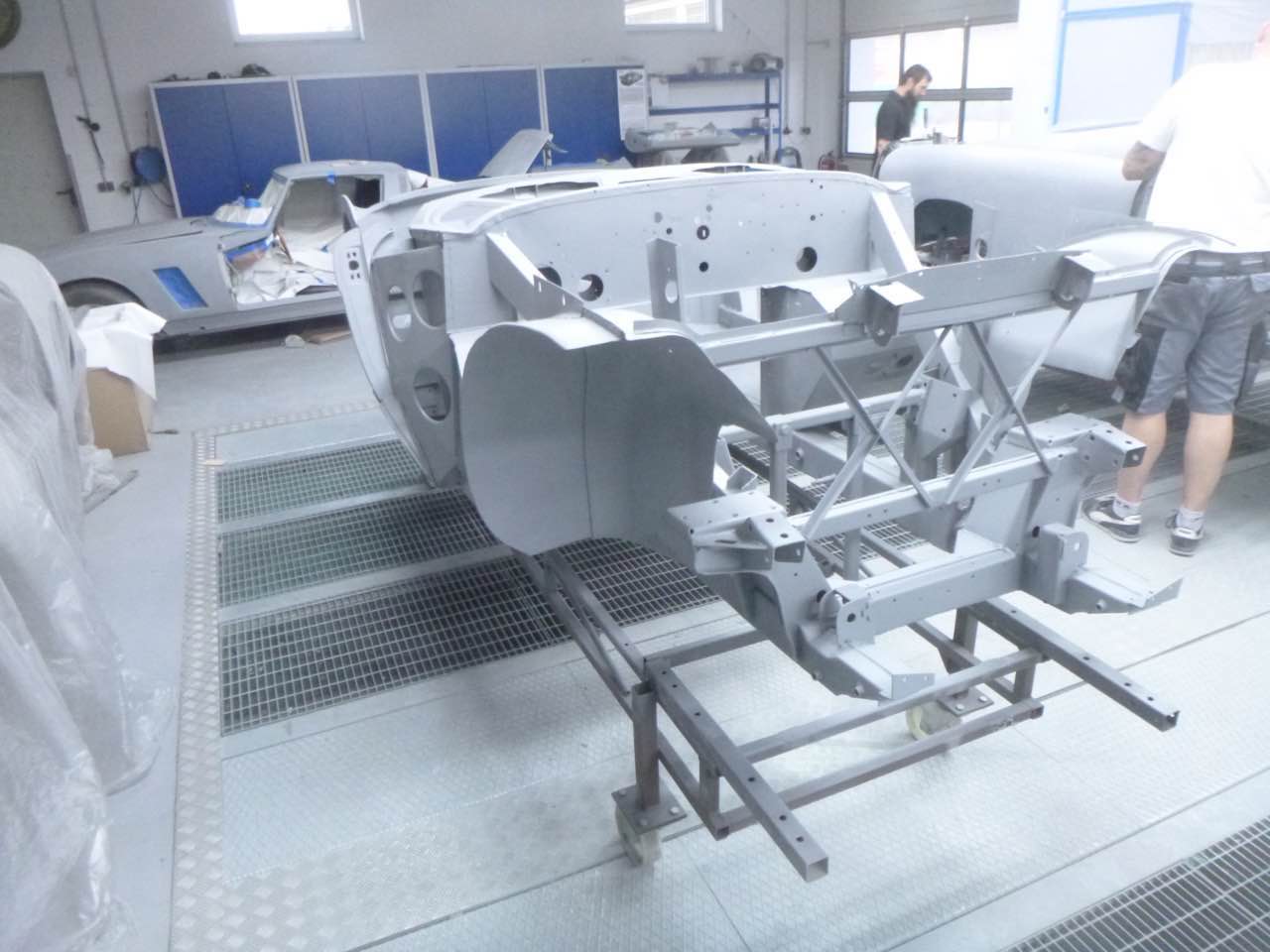 Nach der Lackierung von Chassis und den Innenseiten der Außenbleche erfolgt der Zusammenbau. Anschließend werden die Ausßenbleche gefüllert und geschliffen. Wenn diese Tätigkeiten abgeschlossen sind erfolgt die Montage der Achsen, Motor/Getriebe.