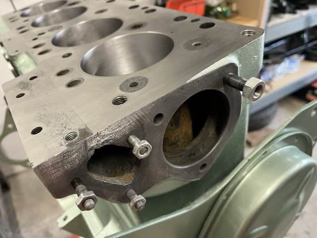 Der Motor ist jetzt in Arbeit, er wurde entlackt und die Wasserkanäle gereinigt. Eigentlich sollten auch schon die Laufbuchsen eingesetzt worden sein, allerdings hat sich beim Bohren gezeigt, dass die Bohrungen bei einem Zylinder sich nach unten vergrößerten.